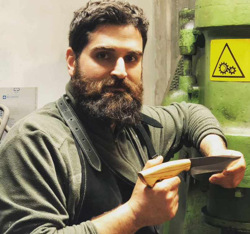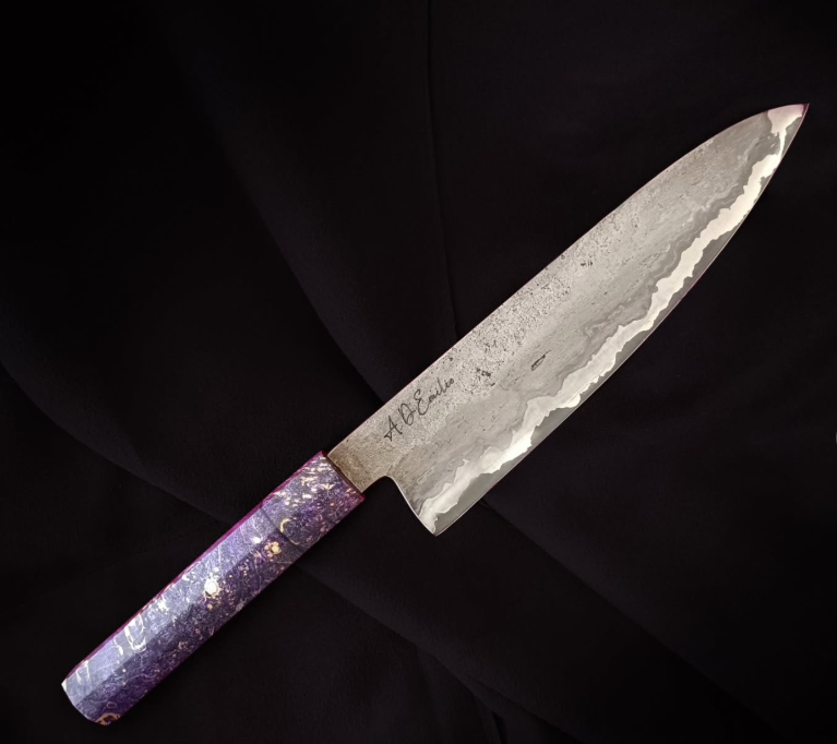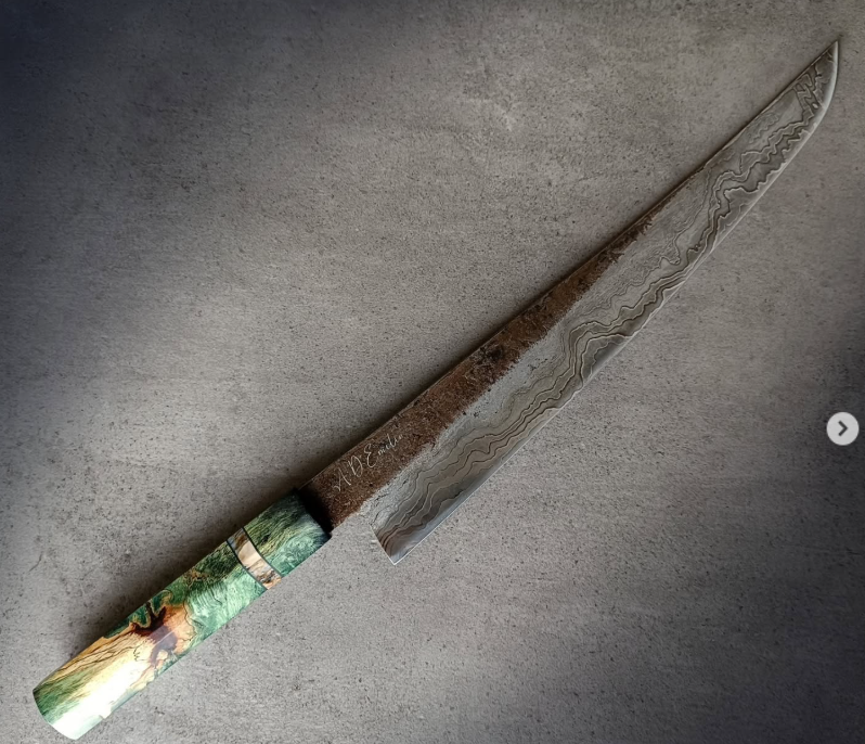 I love making mainly forged kitchen knives, the most beautiful knife I have made, from my point of view, was a kitchen knife. A tuna and large fish sword made with the sides in ancient iron, alternating with other metals and nickel, and with a core steel with a high content of Tungsten. This was combined with a Poplar handle that I stabilized myself, that had a mammoth spacer as a decoration.