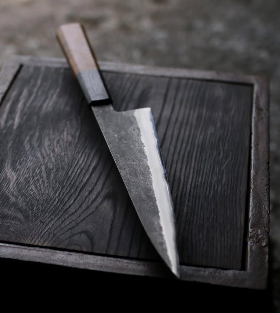 Kitchen knives with a focus on finish that can be easily maintained and enhanced at home / in the kitchen. I like to finish on bench stones rather than a grinder. Low bevels. Kurouchi. Carbon steel blades made with the san-mai technique.