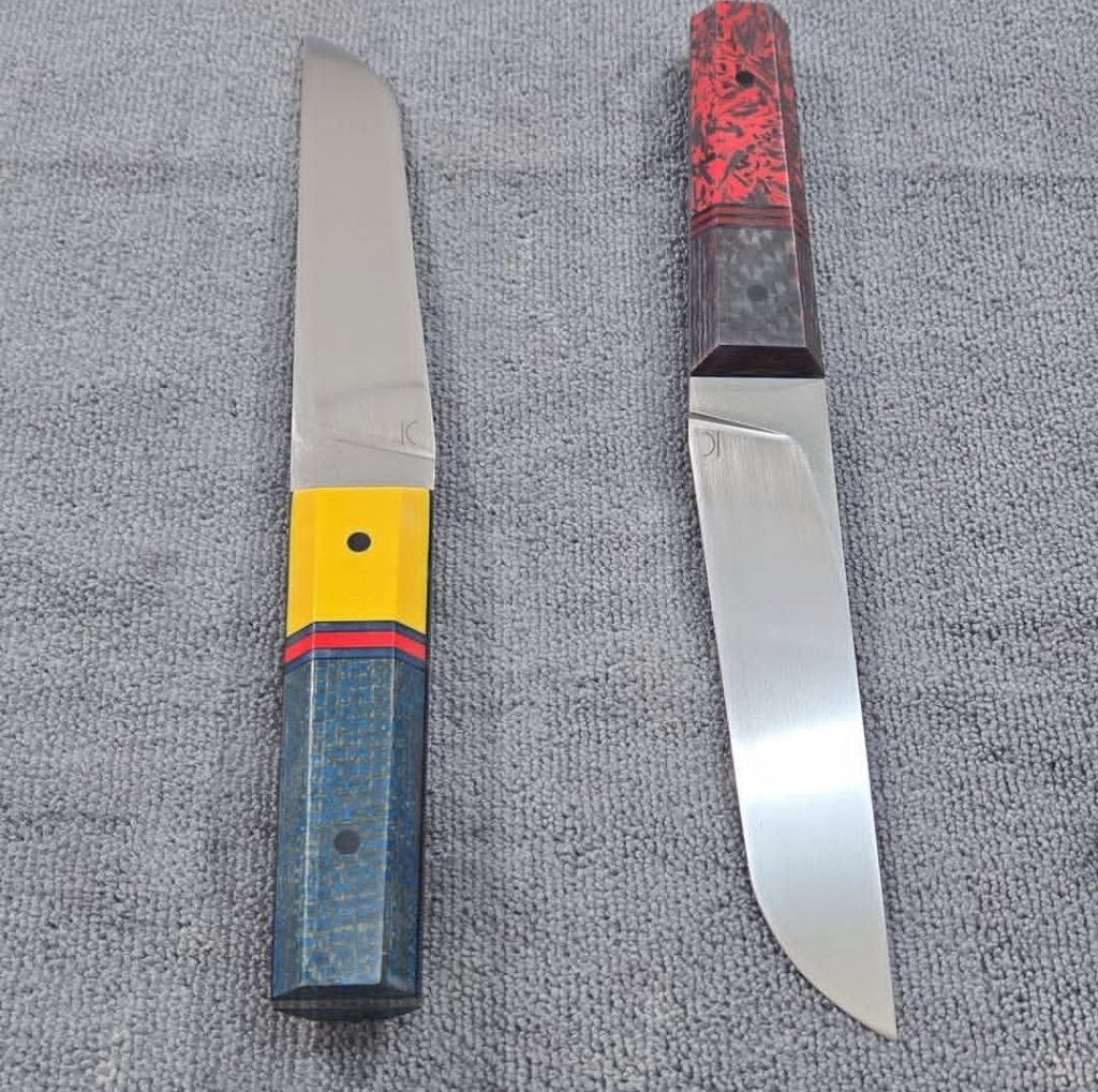 I made my first knife out of a blank Colibri knives sent me while I was waiting on my first batch of blanks to come back from heat treat. It was a carbon steel culinary knife that I finished with a blue and natural maple burl wa handle with a micarta spacer. The first knife I made of my own design was a high carbon skinning knife with a blue and white micarta handle.